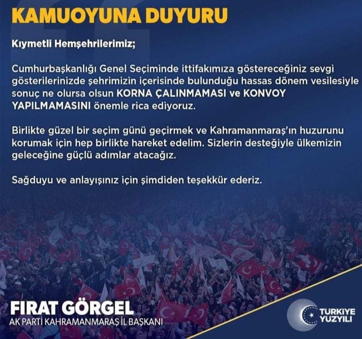 "AK Parti il Başkanı Av.Fırat Görgel,14 Mayıs seçimlerinden sonra bazıları tarafından yapılan konvoy ve kutlamaların önüne geçmek için tedbir açıklaması yaptı ve yaşanan deprem ve yaş nedeniyle konvoy ve taşkınlık yapılmamasını istedi