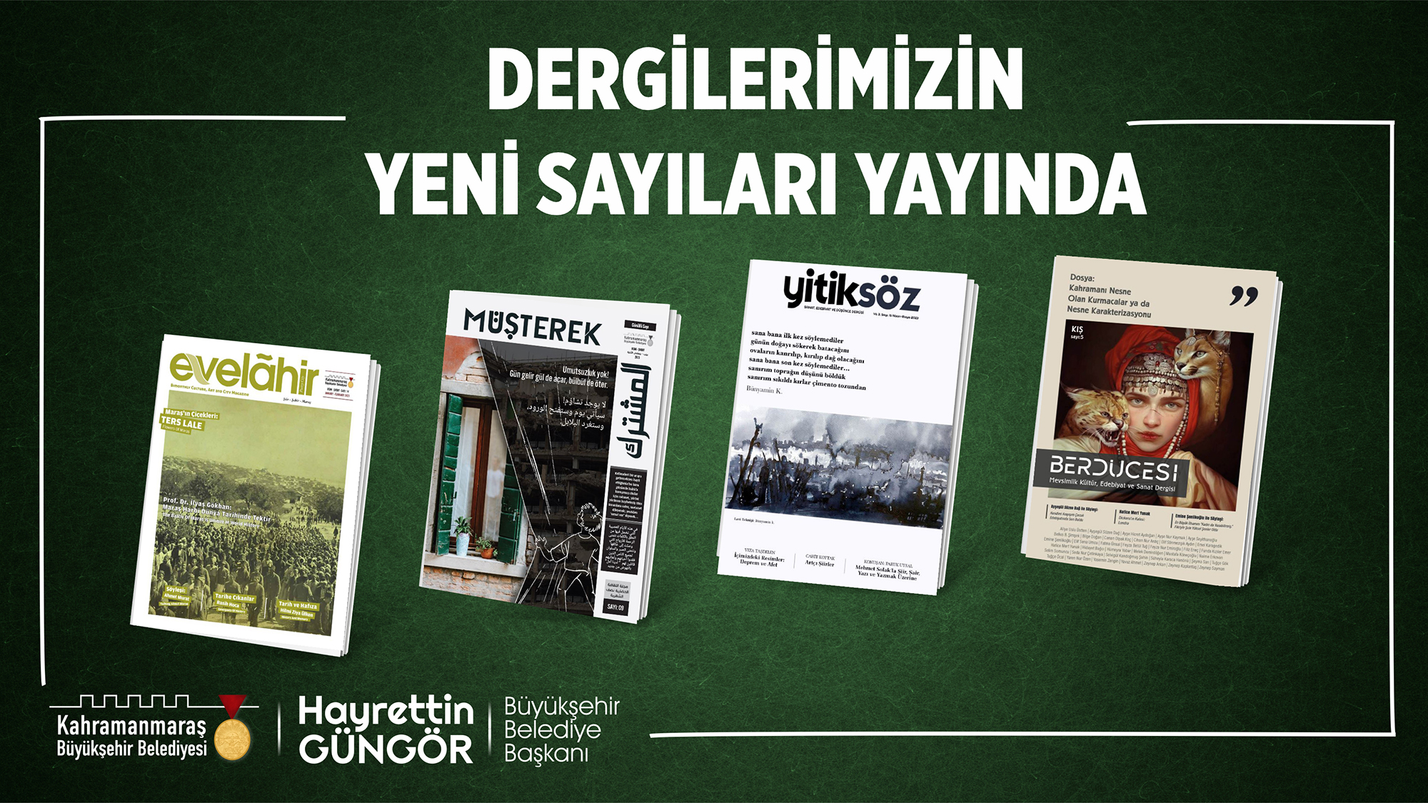 Şehrin tekrar ayağa kaldırılması noktasında altyapıdan ulaşıma, üstyapıdan temizliğe tüm alanlarda çalışmalarını kesintisiz sürdüren Kahramanmaraş Büyükşehir Belediyesi; şehrin kültür envanterini zenginleştirmek, edebi ve sanatsal birikimini artırmak ve kültür sanat etkinliklerine derinlik kazandırmak için Kültür Yayınları’nı edebiyatseverlerle buluşturmaya devam ediyor. Sanat, edebiyat ve düşünce dergisi olan Yitiksöz, mevsimlik olarak yayımlanan Berdücesi, kültür sanat dergisi Evelahir, Türkçe ve Arapça olarak yayımlanan Müşterek dergilerinin yeni sayıları yayımlandı.