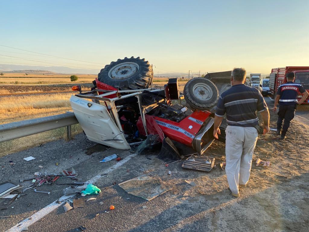 Çarpışmanın etkisiyle traktör devrilirken, tır orta refüje çarptıktan sonra karşı şeride geçti.