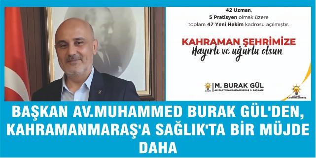 AK Parti Kahramanmaraş il Başkanı Av.Muhammed Burak Gül,Kahramanmaraş'a SAĞLIK'ta BİR MÜJDE daha vererek 42 Uzman ile 5 Pratisyen Hekimin Kahramanmaraş 'a Atandığını söyledi.