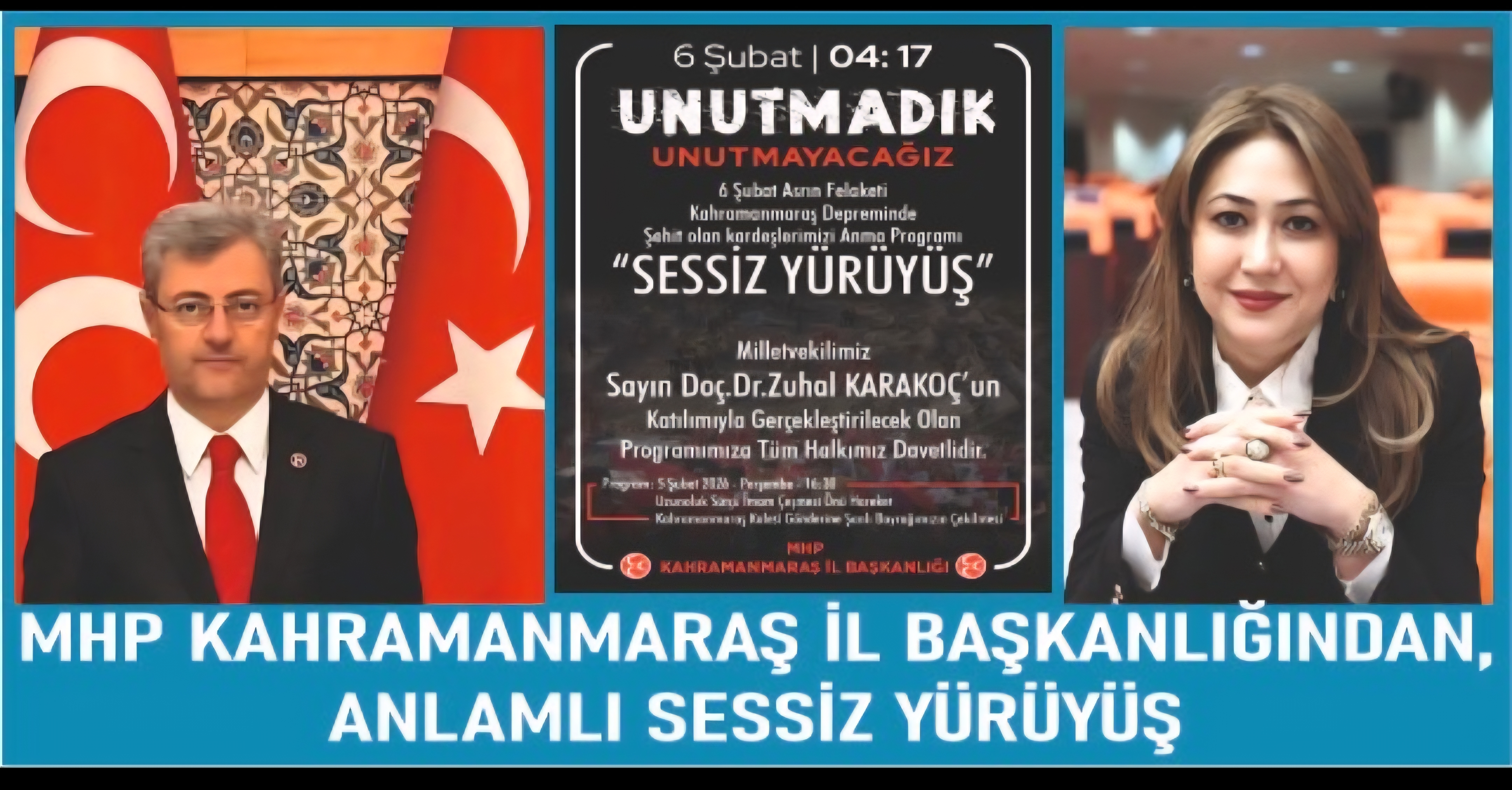 Milliyetçi Hareket Partisi Kahramanmaraş il Başkanlığı tarafından,5 Şubat 2026 Perşembe günü( BUGÜN) saat 16.30 'da,Uzunoluk Çeşmesi'nde başlayıp Kale'de sona erecek olan Milletvekili Doç.Dr.Zuhal Karakoç'un da katılım sağlayacağı yürüyüş gerçekleştirilecek.