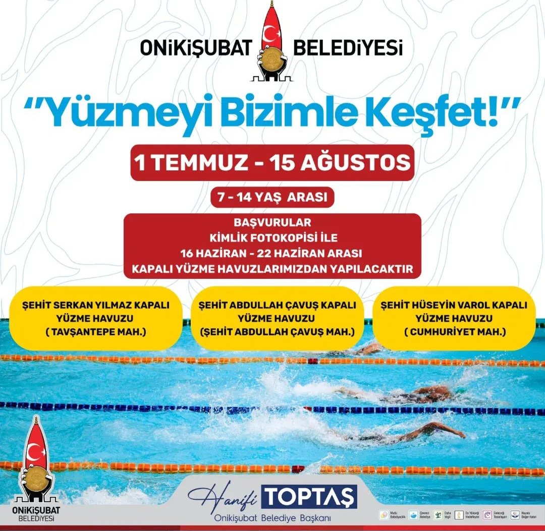 Yaz tatilini hem eğlenceli hem de verimli geçirmek isteyen çocuklar için Onikişubat Belediyesi tarafından hayata geçirilen “Yüzmeyi Bizimle Keşfet!” yüzme kursuna başvurular başladı.