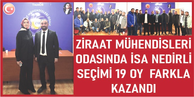Bugün gerçekleştirilen Ziraat Mühendisleri Odası genel kurulunda, Mevcut Başkan Mustafa Kırbaş 'a Karşı,Son iki gün kala aday olan İsa Nedirli Seçimi 19 Oy farkla Kazandı.